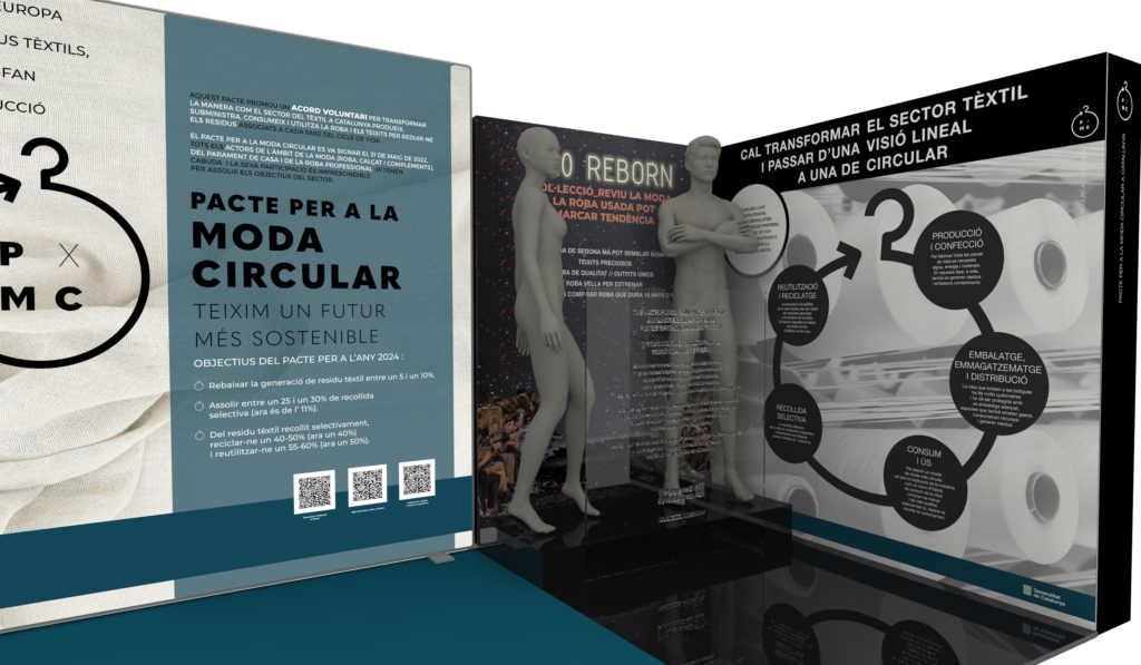 Para explicar este Pacto así como la importancia de cambiar el actual modelo de la industria de la moda, trabajamos conjuntamente con la Agencia de Residuos un stand a ubicar en las instalaciones de la 080 Fashion Week. El encargo fue concebir, diseñar y producir el espacio (dónde colaboré con Freewindi Design) y crear los contenidos. Además, todo lo producido debía ser reutilizable e itinerante. El resultado fue un stand dónde se concentraba el por qué cambiar el modelo actual de la industria de la moda (con relato y datos locales e internacionales) y cómo hacerlo (donde el Pacto y la visión circular de la moda eran el punto central).