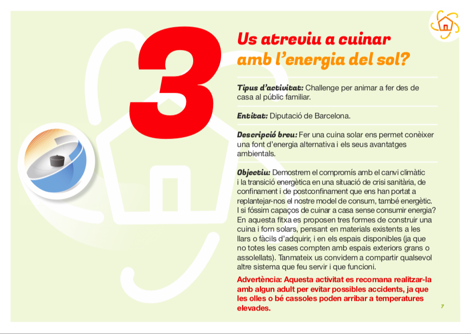 Por encargo de la Diputación de Barcelona he rediseñado tres de las actividades habituales de la Semana de la Energía (en casa) 2020 para que se puedan realizar en formato digital. El trabajo se ha centrado en la selección de las actividades más idóneas, en el planteamiento de los retos, la redacción de las fichas y la coordinación gráfica en colaboración con Lapage Original (estudio de comunicación visual).
