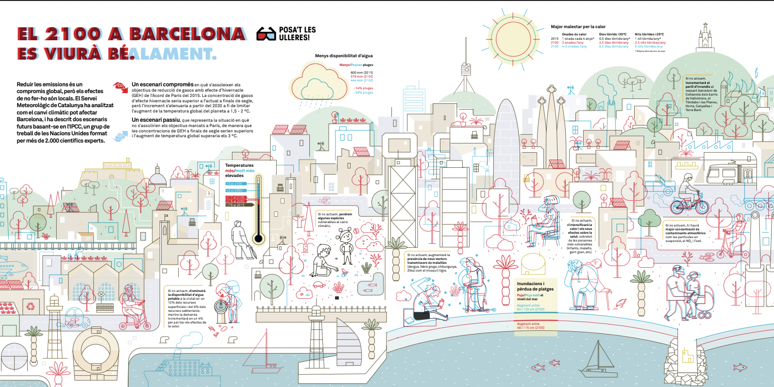 En 2100, en Barcelona, se vivirá bien o mal? Depende de lo que hagamos ahora. En esta ilustración se superponen los dos escenarios: el optimista (comprometido) y el pesimista (pasivo). Con unas gafas se puede diferenciar entre los dos escenarios.