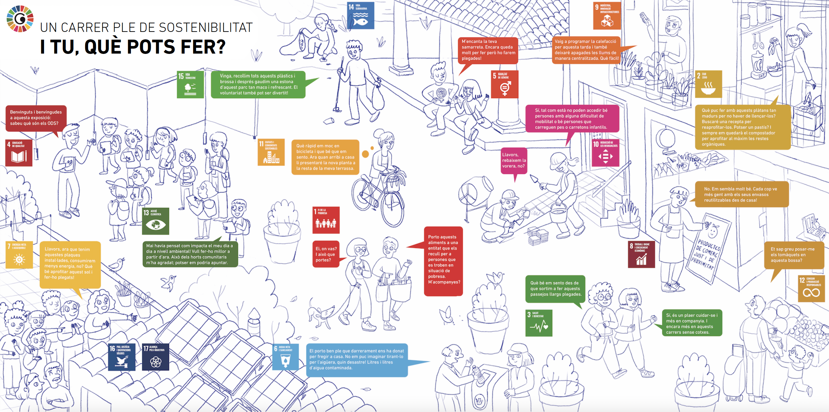 En este caso se optó por dibujar una calle de Granollers y ubicar diversas situaciones que hagan posible entender los ODS en un contexto más cotidiano. Se mantuvo la imagen sin color para destacar los ODS y sus colores característicos.