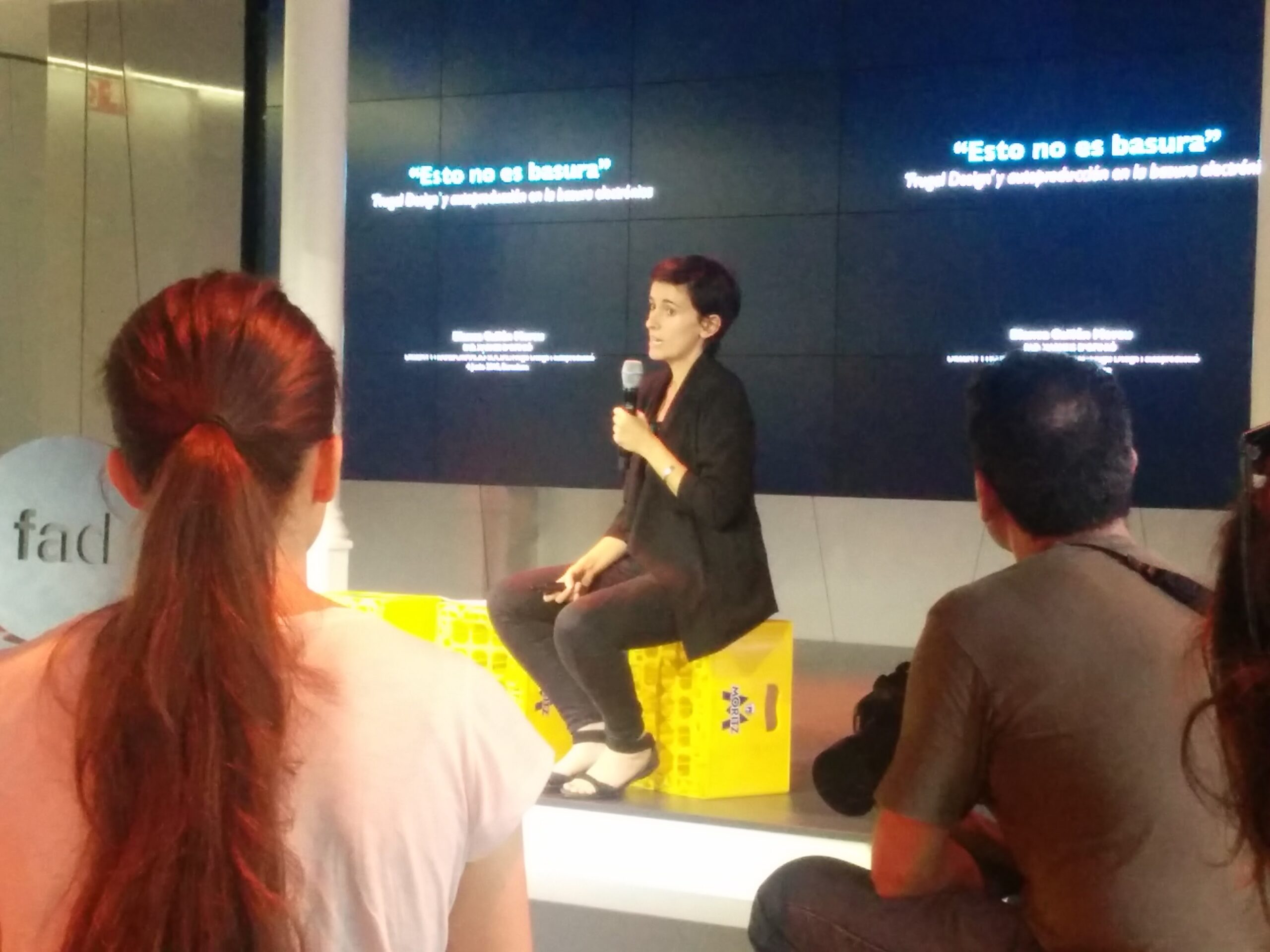 Blanca Callén, investigadora del grup GREDITS (BAU), codirectora del nou Màster en Investigació i Experimentació en Disseny de BAU, membre de Recyhub i de la xarxa internacional Mend*rs (ja no puc posar més links) va ser la següent ponent. Ella va preferir seure en una de les caixes de Moritz, en contraposició als constants passejos de Juanito, que no ens deixava perdre'l de vista: tot ell era un no parar. Blanca, en canvi, seu i transmet tranquil·litat i entusiasme per la seva investigació centrada en els residus electrònics: 'Esto no es basura'. El seu projecte es va recolzar en tres experiències ja existents, com Obsoletos o el Grupo de recolectores informales. I segons el seu estudi els passos a seguir són: