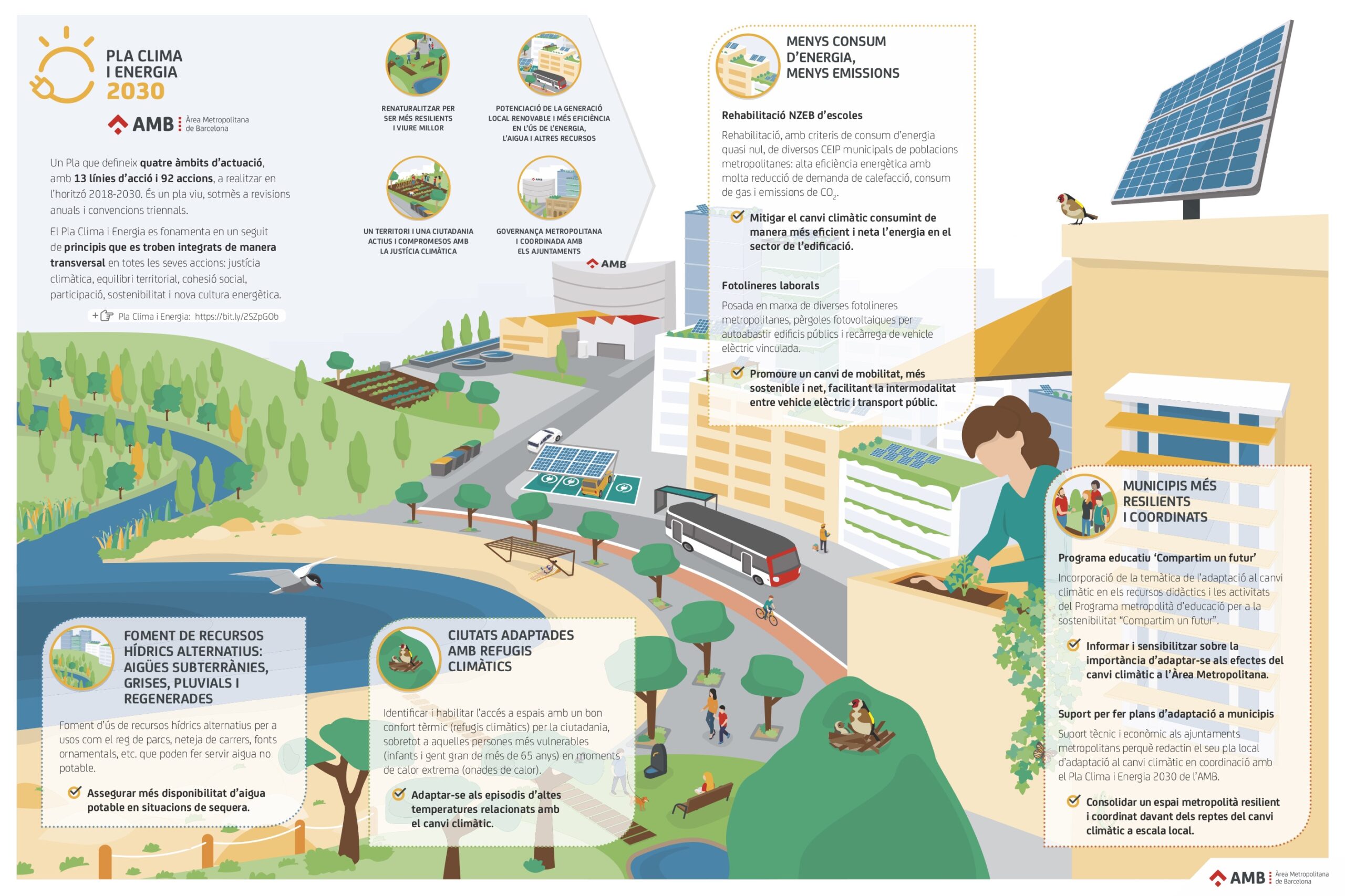 El resultat ha estat una peça divulgativa del Pla Clima i Energia de l'AMB que ja està disponible a la web de l'AMB, concretament al seu blog. D'una mirada es pot saber què s'està fent des de la Direcció de Serveis Ambientals per combatre i adaptar-se el canvi climà tic: reducció d'emissions, transició energètica i adaptació del territori metropolità .
